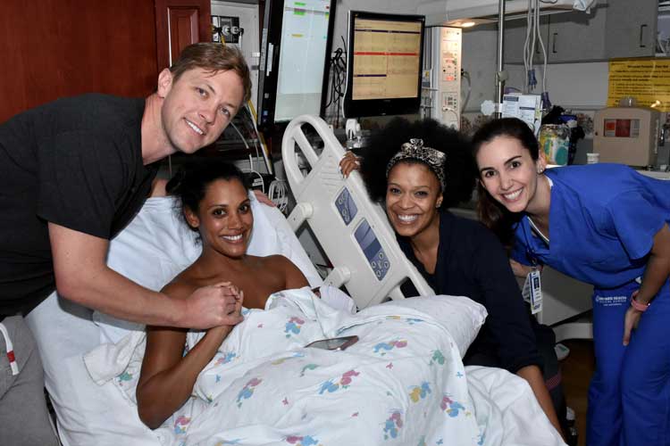 As she entered our house, she looked at me and smiled and simply said that we are in “Real Labor”, which meant a pattern had formed. We have a three story house, so after wandering around the house naked and in a pattern of hot flashes to chills she helped dress me in my gown while Cory and mom packed up the car. As we made our way downstairs in tandem, she rode every “wave” with me by squeezing my hips, forcing me to release tension from my hands and neck and gave gentle yet authoritative direction. As we made our way to the hospital at 3:30 AM, I had an eye mask on, my hypnobirthing tracks on and I simply focused on my breath. In what felt like five minutes, I was being wheeled into labor and delivery and had to sign papers and release forms in between contractions. By the time I was placed in triage, I had bright lights glaring in my eyes, monitors on my belly and fingers in all sorts of crazy places. Nurses asking Iana and Cory, what I was listening to, and I tried my best to remain limp in such an uncomfortable, vulnerable position. Much to everyone’s surprise, I was 6 CM dilated and immediately asked to WALK into the delivery room. Like, EXCUSE ME? I was slapped with a “fall risk” bracelet and escorted down the longest hallway ever!