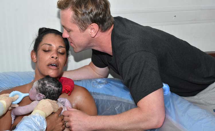 Two contractions and a comfortable “all fours” position later, I felt ready to push! I am not sure how long or how many it took at this point, but when Lindsay said “WOW! He has a full head of hair.” She instructed me to reach down, and after I felt that he was literally cm’s from the water I said: “All the heartburn was worth it….let’s do this.” At least I think I said it, I may have grunted it, but everyone laughed and we braced ourselves for the final surges. Two more contractions and his head was out. I mustered up all of my strength and in one more push, he was out in the water and in our arms. The greatest, most powerful moment of our lives. We did it!!!