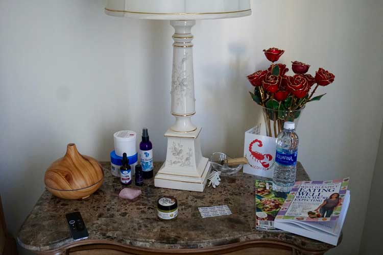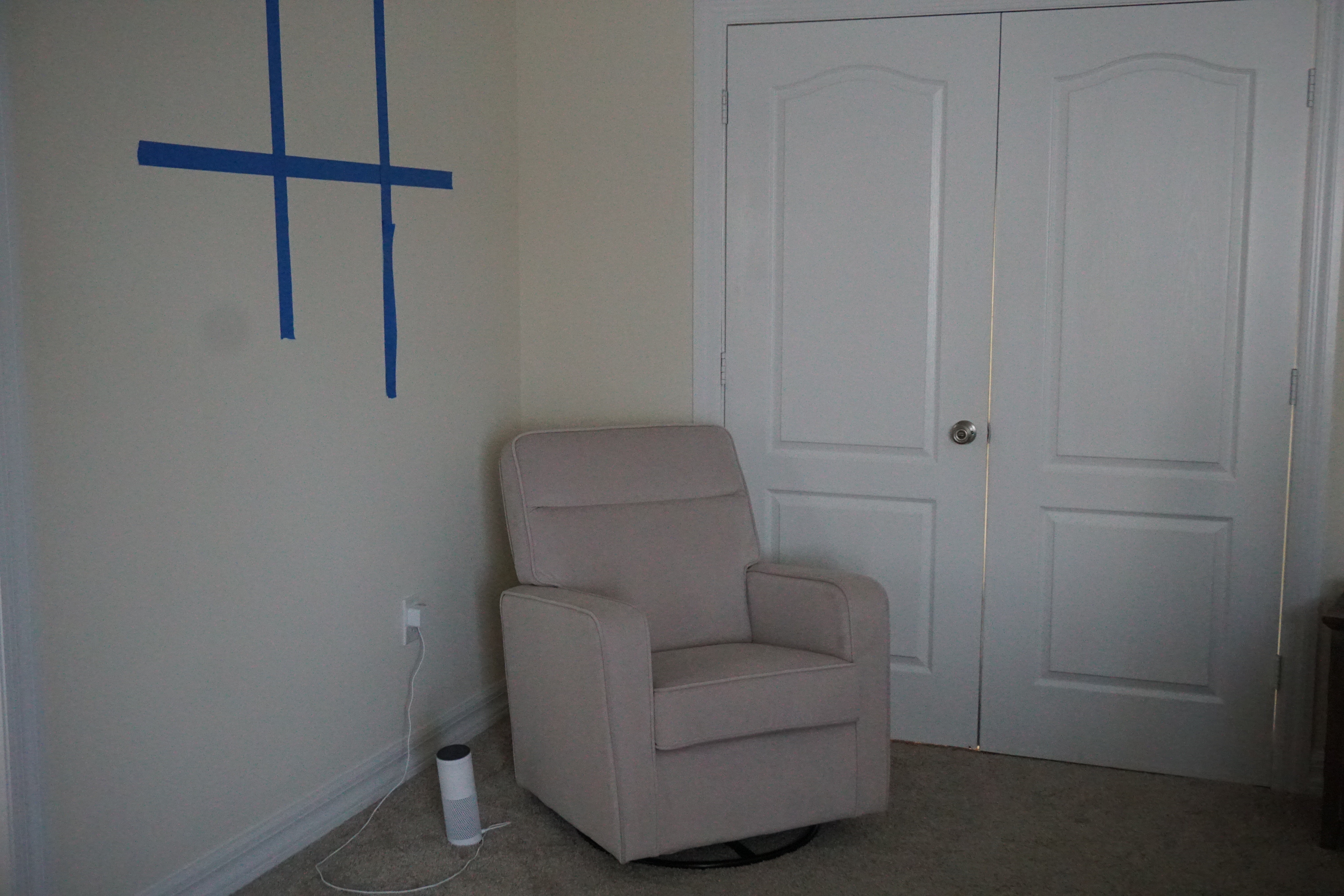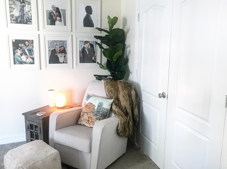 Add Seating and Storage: The addition of the glider has honestly been amazing. The size is perfect for a bedroom and comfortable enough for both of us to use. Thanks to feeding nook advice from my Instagram friends, I added an end table with storage and a power station. The end table has two USB and 2 regular electrical outlets. Perfect for my salt lamp, my phone and my friend “Alexa”. I love having a plush pouf like this one that is super easy to move yet allows me to relax in comfort. This is something I know will come in handy during those sleepless nights we will no doubt endure. BTW I have also been keeping my phone plugged in overnight at the nook. This way I am not tempted to look at it during the night or first thing in the morning.