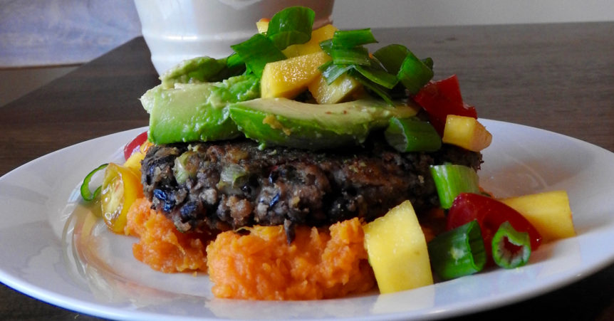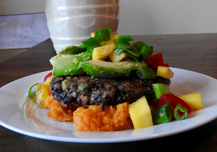 Plate: Lay down sweet potato mixture, top with patty, avocado, salsa and remaining green onion. Enjoy!