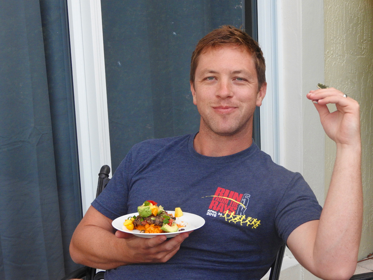 I have made my southwest black bean burgers many times over, but never for Cory because he is a meat and taters kind of guy; however, last week I went to my friend Naomi’s sisters house for vegan taco night and couldn’t believe how much a mixture of vegan soy crumbles, chopped mushrooms, garlic and onions took on the texture of meat. SO what I created was a dish of a delicious patty over complex carbs [sweet potato] and topped with healthy fat and a sweet mango salsa. It truly looked beautiful, but the expression on Cory’s face was priceless. We both were satisfied and a meat-free meal felt good on the tummy!