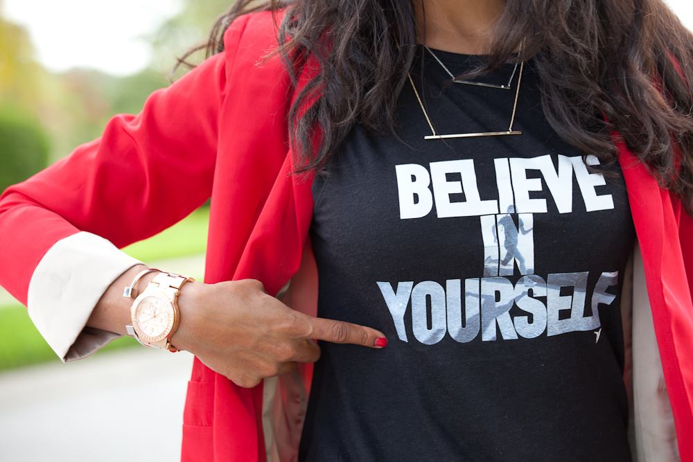 As you may know from my previous posts, I have had a thing for graphic T-Shirts with quirky or inspirational sayings on them since my days working at Abercrombie & Fitch in high school. This look is a little more grown-up and if you work in a creative environment it would be more than appropriate. I saw the T-Shirt/blazer combo for the first time when I danced for the Nets. The heads of entertainment consistently paired tees with power suits, and the look was both laid back and corporate at the same time. Perfect for the fast paced world of professional sports world.