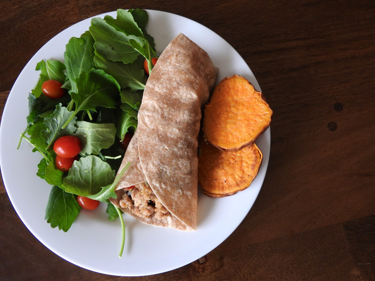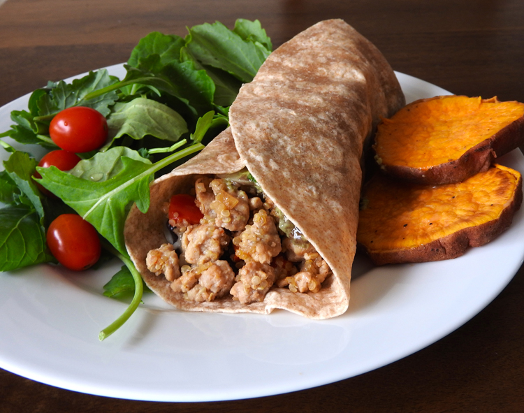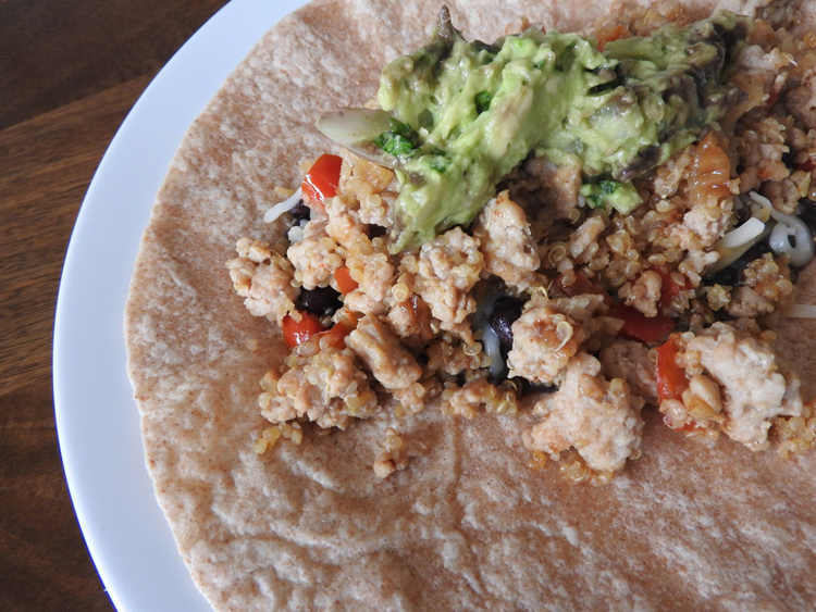 I love having Taco Tuesday, but how about burrito Monday? On the menu Monday was chicken burritos with black beans, fresh guac, sweet potatoes and a baby kale salad. I really love when Cory enjoys the healthy meals I create. The sound effects and numerous amounts of compliments make me happy. He works so hard, with many early mornings and nights on the road that it always makes me feel good when he can eat a good wholesome meal. These burritos will be something that everyone in your family will love.