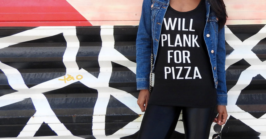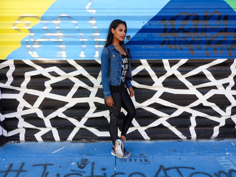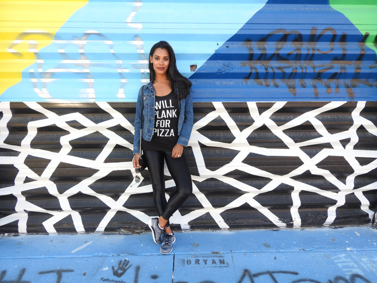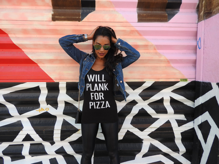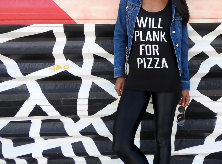 Denim Jacket (Similar) // Will Plank For Pizza Tank Flying Lizard Boutique // Tights Koral Activewear Sculpthouse Boutique // Wallet Coach (similar) // Sneakers Nike TR FLYKNIGHT // Aviators