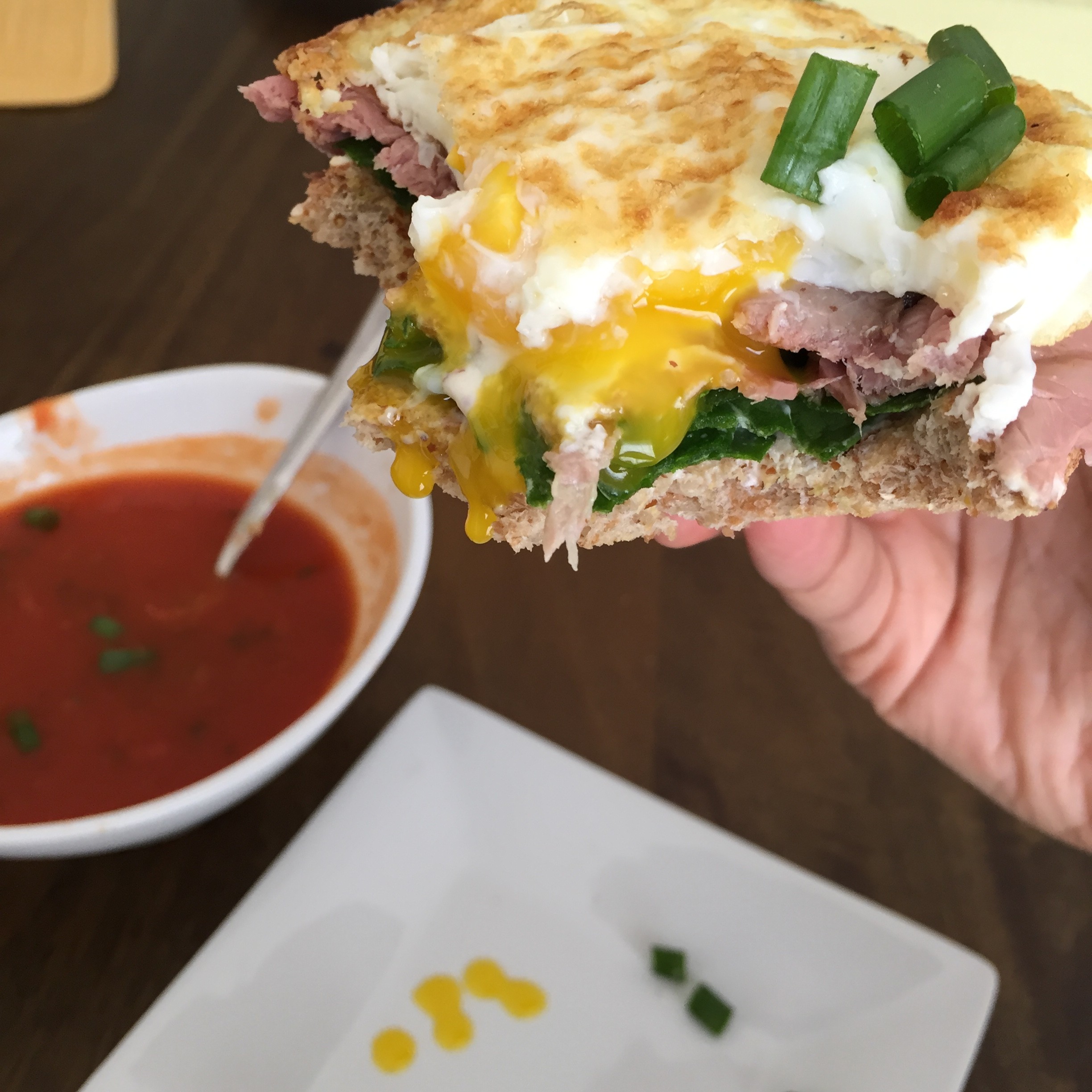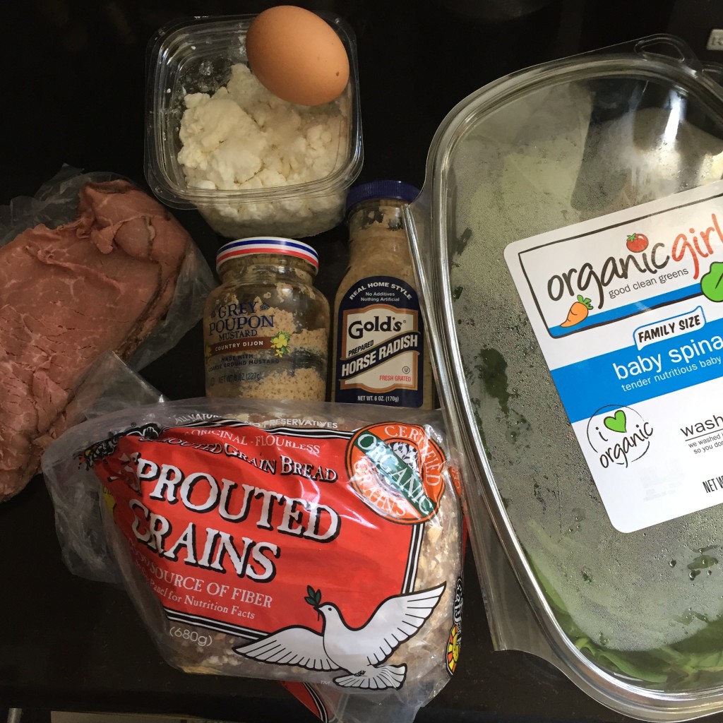 Toast bread and fry egg in olive oil over medium heat until yolk is desired texture. Mix together goat cheese, mustard and horseradish and spread on toast. Top with spinach, beef and fried egg. Add hot sauce or green onion and serve. I had mine with a cup of tomato soup and it was yummmmyyy!!! I would love to hear about your quick meal ideas.