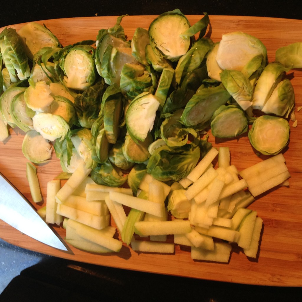 Slice sprouts as thinly as possible. Try 1/16 of an inch. Thinly slice green apple. Place in a bowl and set aside.
