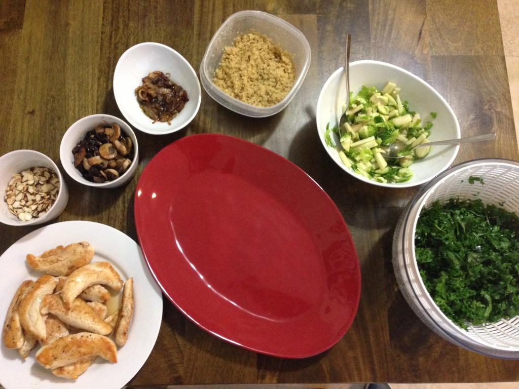 Place kale on a large platter. Top with almonds, onion, sprout/apple mixture, quinoa (optional) and your choice of protein. Top with additional dressing and toss. I had a package of chicken tenders that I grilled, but any protein would be great!