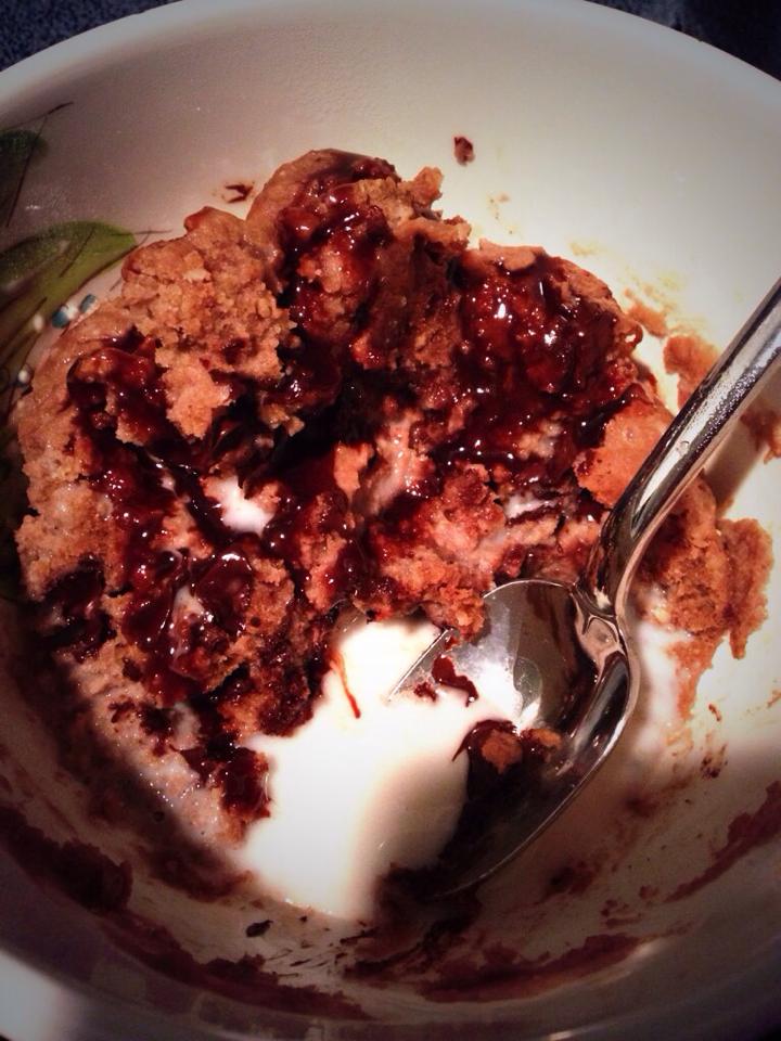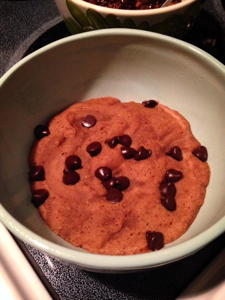 Grease 2 bowls with oil of choice (I use canola oil spray) split the batter in half and sprinkle with the chocolate chips! Then microwave for 1 minute and 40 seconds. Top with 1/4 cup of almond milk and a drizzle of ah!laska choc syrup!