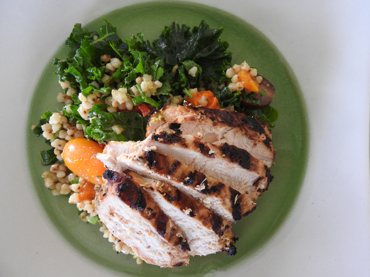 Mixed vegetables in herbal vinaigrette, served on sorghum grain, topped with rosemary roasted chicken