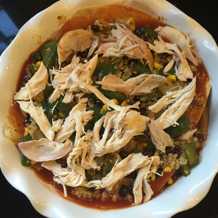 Grease 9 inch pie plate, Add enchilada sauce, top with tortilla, top tortilla with pepper mixture add quinoa and shredded chicken and small sprinkle of cheese. Repeat. Top with final tortilla (3 Total) add enchilada sauce and top with cheese.