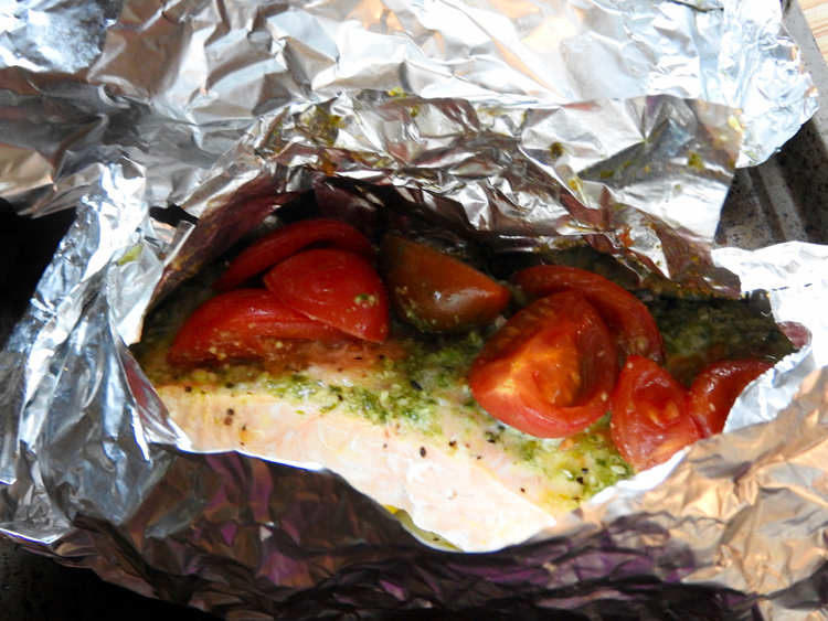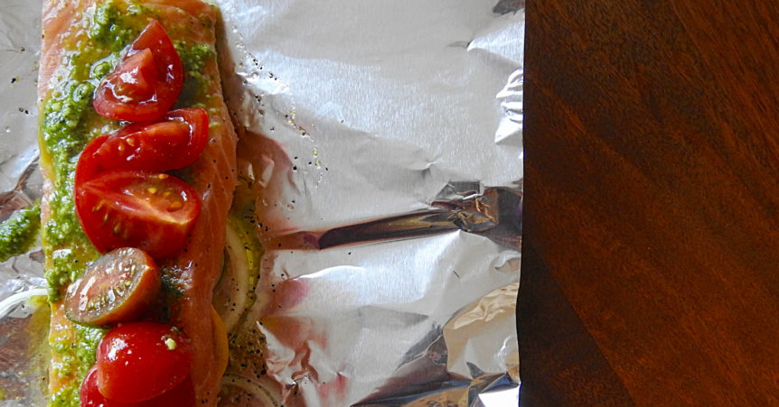 Honestly, I am not a big fish person, but I am playing with recipes to incorporate low-mercury fish sources into my diet twice a week instead of eating chicken every night. Last week I shared my salmon salad recipe, and this week is an easy easy salmon wrapped in foil which means minimal clean-up! For dinner I can do vegetarian options like a black bean burger or lentils, which are packed with protein, but my my hubby always needs a balanced meat or fish dish. I try to buy protein in bulk from Costco. They have a great selection of wild-caught fish, organic chicken and grass-fed beef! I went yesterday to stock up and apparently Costco is the place for fitness enthusiasts because every gym-rat I passed commented on the contents of my cart and followed up with a dinner invitation. So if you are looking to meet a man invested in his fitness, go to Costco and fill your cart with organic meat, veggies and coconut oil and let the games begin. If you aren’t interested in that, and would rather add a healthy and easy 2 for 1 recipe to your repertoire then continue reading here!