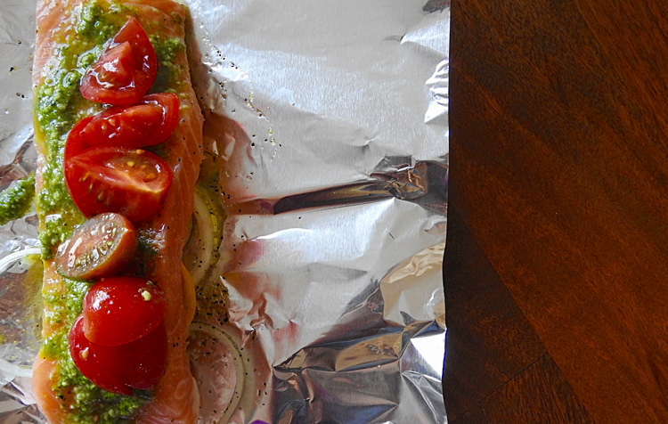 Preheat oven to 400 degrees. Lay out foil (one per filet). In a separate bowl combine tomatoes, vinegar, garlic salt and a drizzle of olive oil and set aside. On foil, layer onion, top onion with a layer of lemon slices and drizzle with olive oil. Top with salmon filets. Buy canned pesto or make it fresh and top each filet with a tbs of pesto, top pesto with marinated tomatoes. Tightly roll foil packages and back for 20-25 minutes or until cooked through.