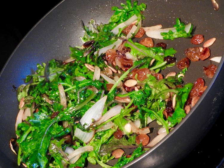 While salmon is cooking melt coconut oil in a pan, once melted and hot add onion and cook until they begin to soften, add raisins and pepitas and cook 1-2 minutes. Add red pepper and stir. Add kale and stir until wilted and remove from heat. This should only take about five minutes and should be served immediately.