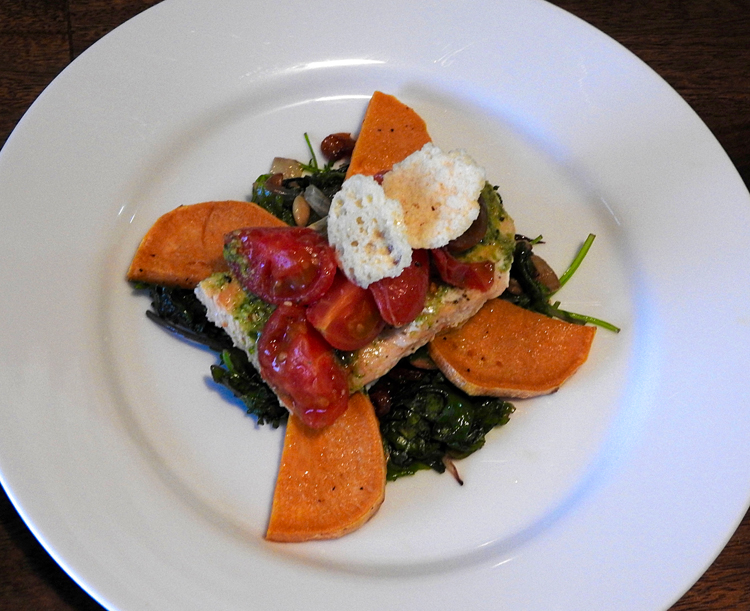 Cory and I have been trying to work on controlling our portions, and it is amazing to come to the conclusion that we feel so full from one serving as opposed consuming all of the food on the table. So I plated this dish like I was on Chopped. I served it with the sautéed kale mixture, sweet potatoes ( a complex carb) and topped the salmon with parmesan ‘Whisps’. Which are incredibly delicious and also found at Costco. Happy Tuesday! I hope everyone has a great week.
