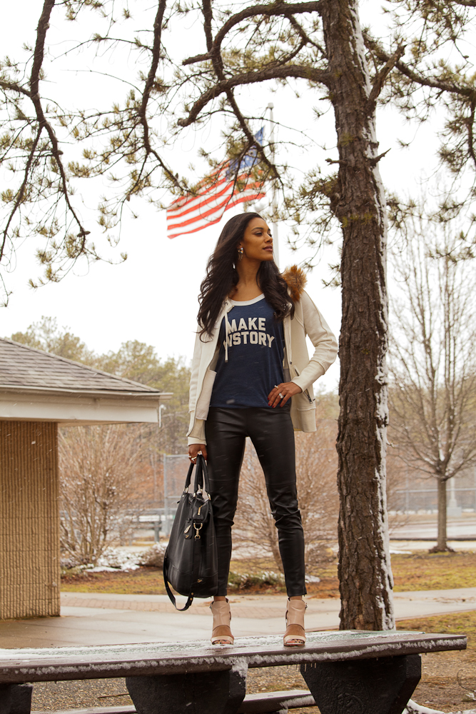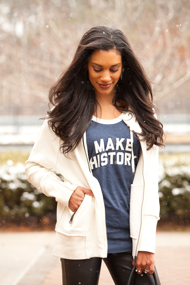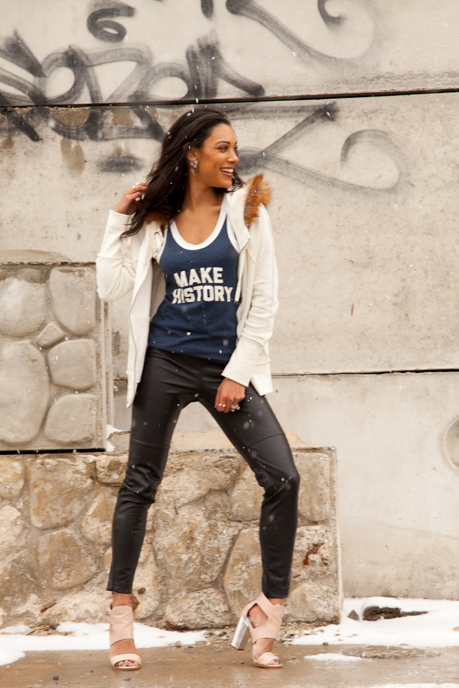 On the first day of spring in New York we were bombarded with a glorious snow storm and a week later the forecast only called for flurries, but Long Island was hit with yet another snow laden weekend. As soon as I hear the word spring I want to break out my open toe shoes and tank tops, but mother nature has had some other ideas in store. Mama Judes and I decided to have an adventure when we realized the snow was not going to give up. The weather only added to the vintage edge of my new favorite gym tank, and these days, as the weather gets crazier and crazier I believe layers are a MUST. Since college, I have always loved to buy shirts with great sayings splashed across the chest. Throw them on during a workout or for a day where you need to feel inspired. This chic vintage-style tank from Under Armour is the perfect look for my first transitional, spring, edgy layered look, and remember…