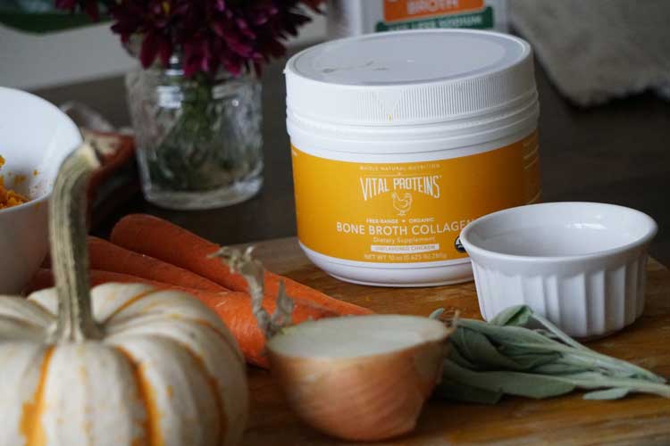 I love adding Bone Broth Collagen to soups and casseroles like my chicken soup or butternut squash mac and cheese. If you keep the dishes savory the Bone Broth Collagen will remain flavorless and completely dissolve, but you will gain all of the gut healing benefits. You can even make a simple bone broth with vegetables, bones, herbs and Collagen Bone Broth and sip on it during the winter months. Just like you would a cup of tea.