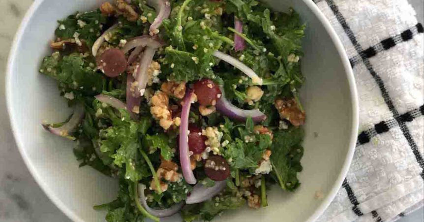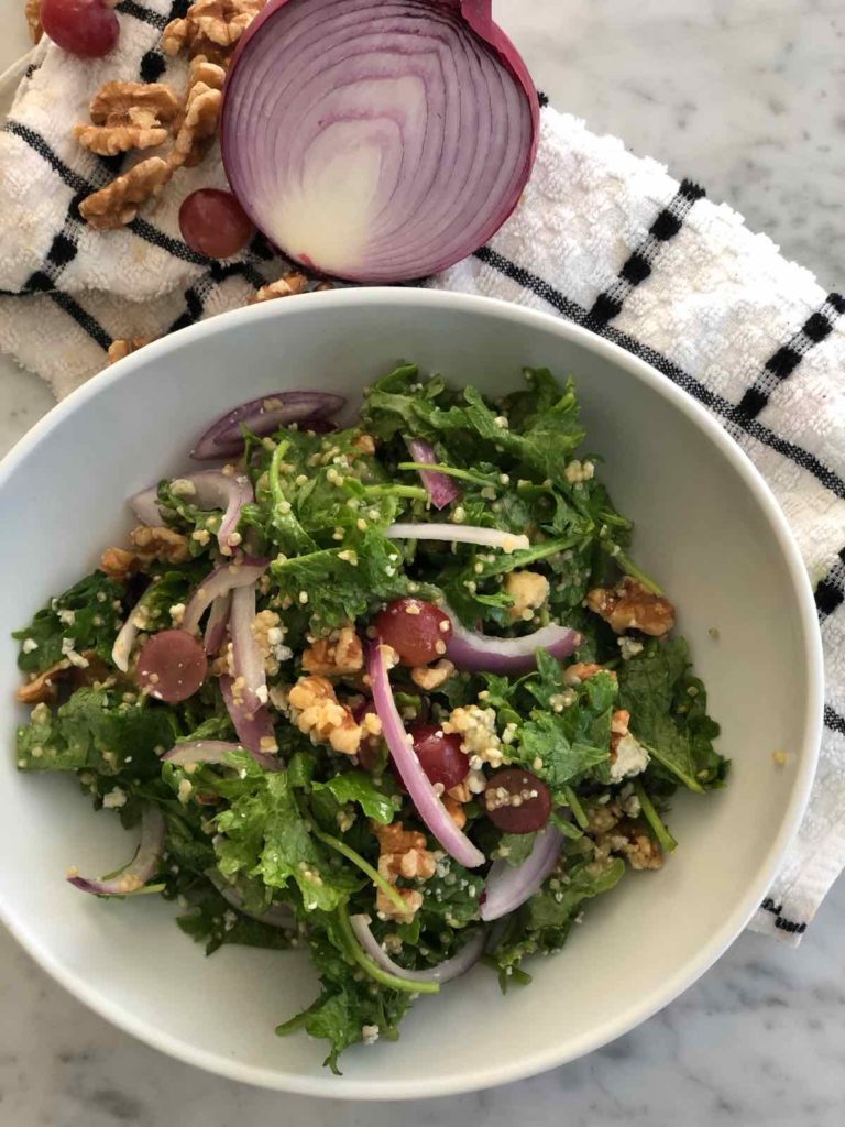 Wash and dry greens add cooked quinoa and toss with dressing to your desired thickness. Combine the remaining ingredients: red onion, grapes, blue cheese and walnuts and toss. Add a little bit of extra dressing if needed, lots of fresh black pepper and save excess dressing in an airtight container.