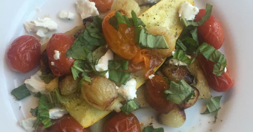 Directions: Preheat oven to 400 degrees. Place onions in a small baking dish and drizzle with olive oil and balsamic. Bake for 25-30 minutes until they caramelize and soften. Combine dressing ingredients. Place eggplant and zucchini on a baking sheet lined with parchment paper. Brush veggies with dressing and bake five minutes on each side.  Wash and dry tomatoes. On the last five minutes dress the tomatoes in oil and bake. Remove zucchini and eggplant and broil tomatoes until they start to burst.Remove from oven and layer eggplant and zucchini. Top with tomato, onions, goat cheese and chopped fresh basil.