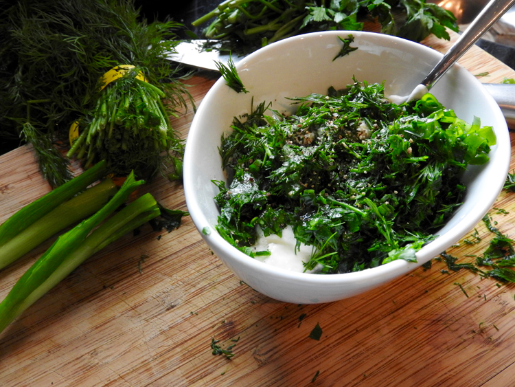 2 Tbs of each herb used. (At least 3 different types. I used dill, parsley and green onion)