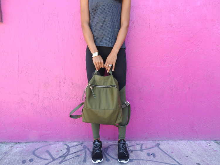 Speaking of convenience; the backpack shown here has become my daily savior. It was gifted to me by Sol and Selene, and it is now my ‘go-to’ for every class and casting that I have. Backpacks are so trendy right now, and this one is the perfect size to carry everything I need for class, castings and beyond. They have so many colors and styles that there is something for every mood and day of the week. Also, if you use my discount code: TAYLOR&SS! my amazing readers can enjoy a 15% discount! Olive green is a color that is flattering on all skin tones and also one a gravitate to. So when I saw the bag and bottoms I could not resist.