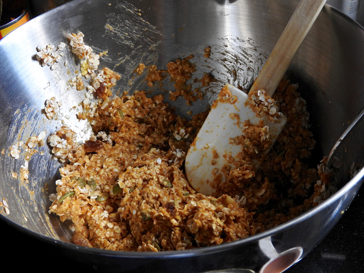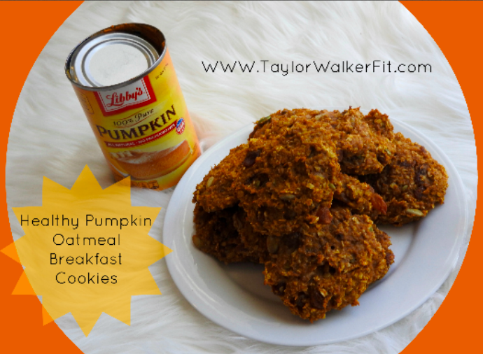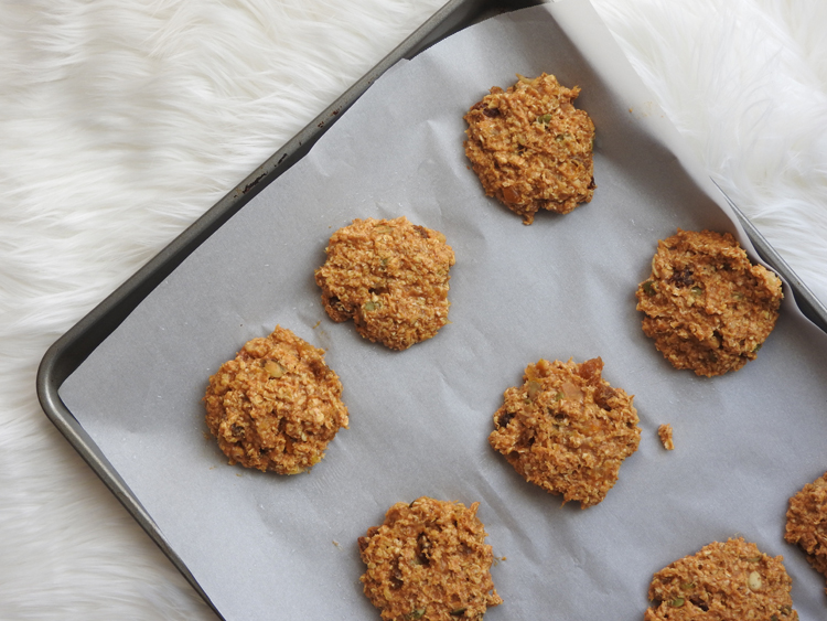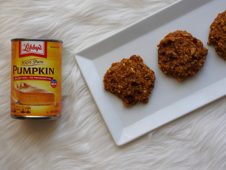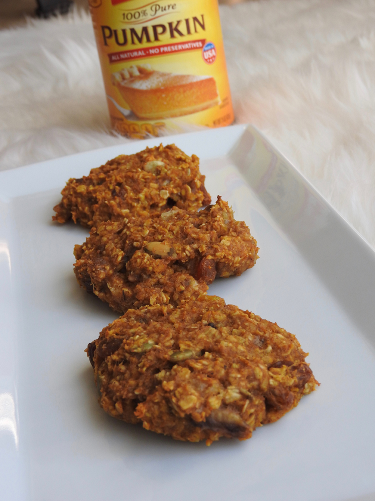 Preheat oven oven to 350 degrees. In a large bowl mash banana then combine all of the above ingredients and mix. [ I like to use my hands.] The mixture should be moist not dry. If it is too dry simply add more pumpkin and/or more egg. Form cookies into small patties and bake for 12-15 minutes or until set in the middle.
