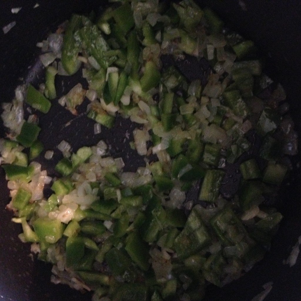 Pour oil over medium high heat. Add onions and cook until almost translucent add garlic and stir for one minute. DO NOT BROWN GARLIC. Add peppers and cook until they begin to Soften.