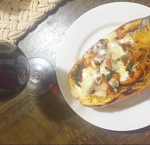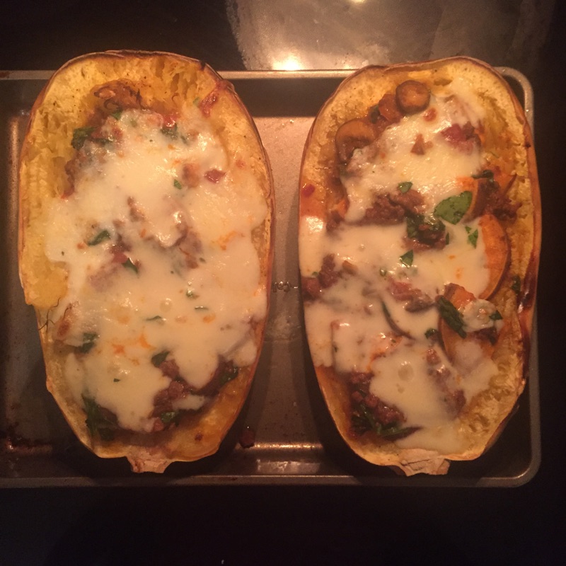 Remove squash front he oven and add some of the meat mixture to the center on the squash, top with a little Ricotta, add more mean mixture and top with half of the mozzarella. Bake for another 15 minutes and serve immediately.
