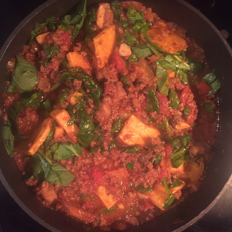 Preheat the oven 350 degrees. Microwave the squash for five minutes to soften. Peel and slice sweet potato, lay on the pan and drizzle with olive oil. Bake for 15-20 minutes until soft, but not mushy. Cut squash in half, scoop out the seeds, drizzle with olive oil, salt, pepper and bake for an hour. In the mean time heat oil in a pan, add onion and let soften. Add red pepper and garlic and let those soften. Add mushrooms, spices and cook until soft, but not completely cooked through. Add the meat and cook until browned, add diced tomatoes and simmer. Add potatoes and mix in spinach, salt and pepper to taste.