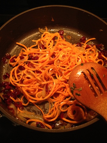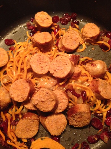 Now that you have the spiralizer….or the need to make low carb pasta, let’s get to work! When the hubs raves about a meal, and says “hey Tay, you can definitely make this again”, all the while searching the bottom of the bowl for any remaining bits…I know the recipe is a keeper. This one was inspired by the idea of one-pot creations. Cory usually does the dishes after I make dinner (Yes….he does dishes ladies) so I decided to go easy on him the night I created sweet potato, sage and cranberry pasta with Italian Turkey Sausage.