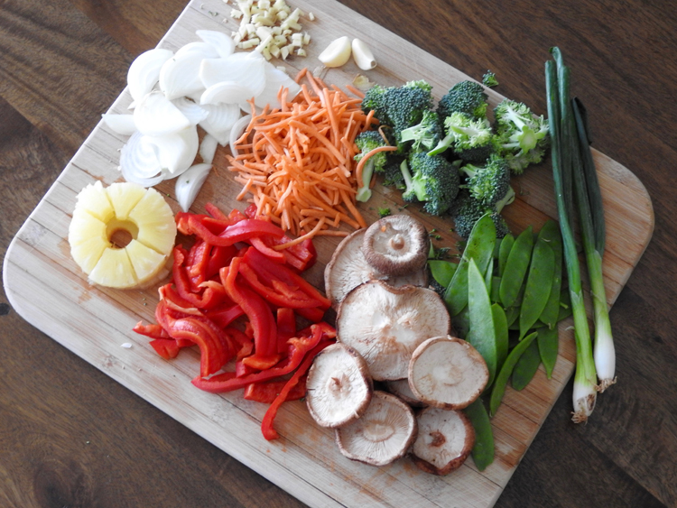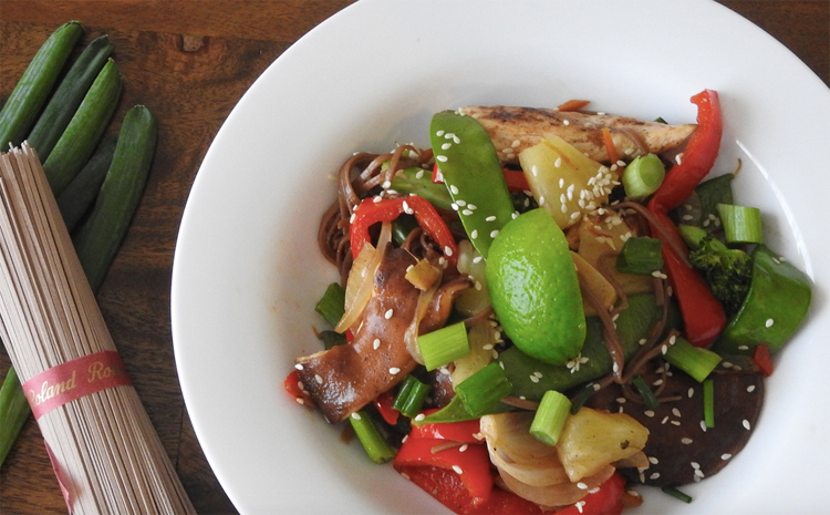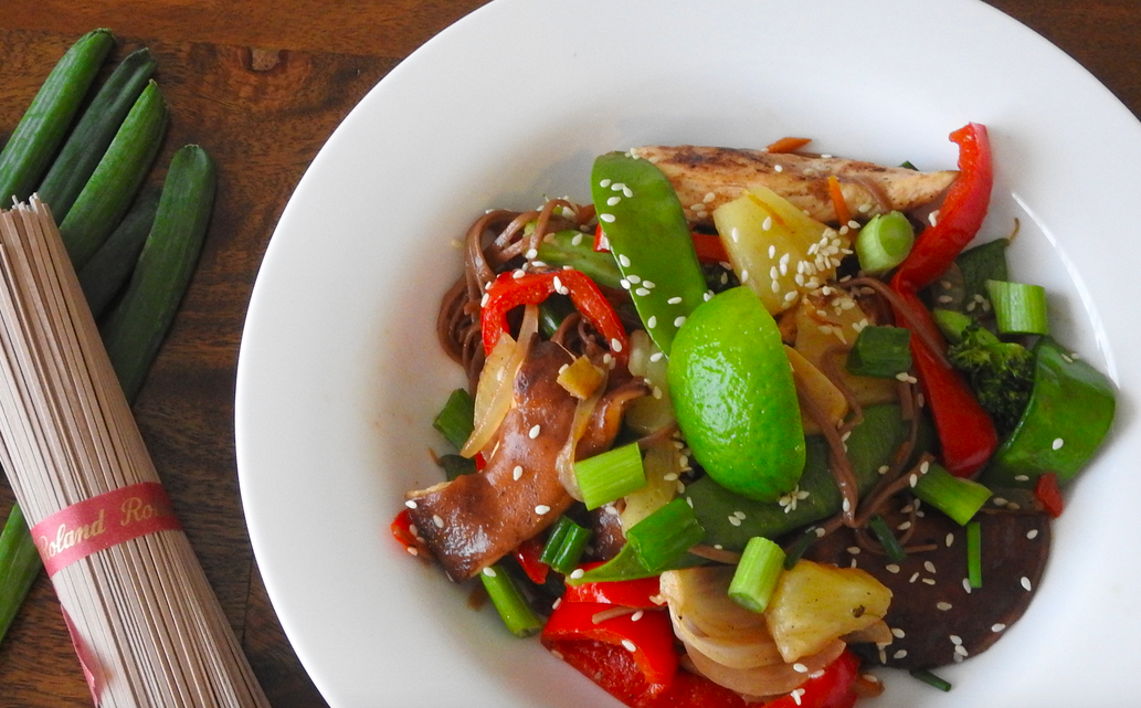 After veggies are soft and noodles are cooked, add noodles to the pan and turn up the heat. After heat is high, add stir fry sauce to deglaze the pan and coat veggies and noodles. After about a minute turn the heat down and stir in pineapple and chicken until warm. Add stir-fry to a bowl, top with sesame seeds, green onion and a squeeze of lime!