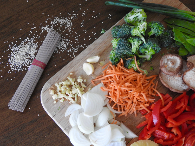 I have had a package of buckwheat, otherwise known a Soba Noodles, in my pantry for a while now, and simply needed the time and energy to create a new dish. When Cory is out of town, I usually have a simple dinner, like a salad or call in my favorite red curry; however, I decided to put my chef hat on last night because I wanted something both satisfying and filled with the veggies I just picked up from the farmers market. I usually do my grocery shopping on Monday’s where I stop at Publix for meat, cheese and eggs before heading to the farmers market for my produce. I am in love perusing the market, and buying local. So for the week, I will be making soba stir-fry, salmon and a light eggplant parmesan with all of the ingredients I picked up yesterday.
