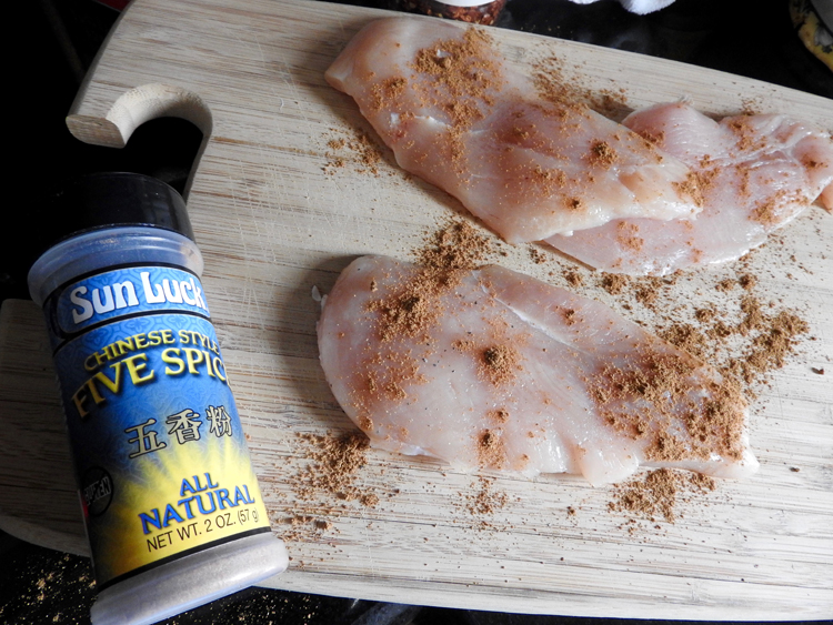 Put water on the stove to boil for the noodles. Add sesame oil to a pan and heat over medium high. Cover chicken in 5-spice, slice, and add to warm oil cooking. 2 minutes on each side for thin chicken breasts. When browned on each side, set aside. When the water is boiling, add noodles and cook for two minutes and drain.