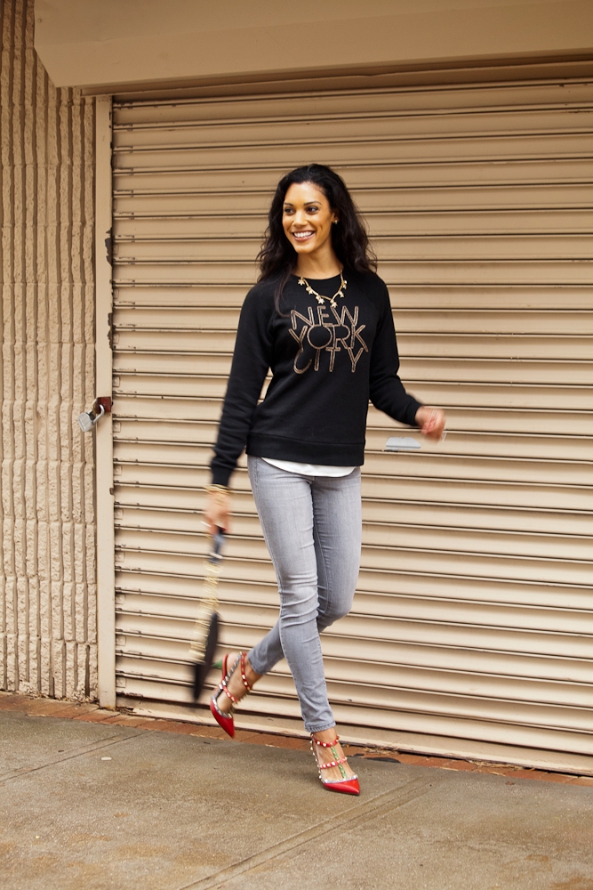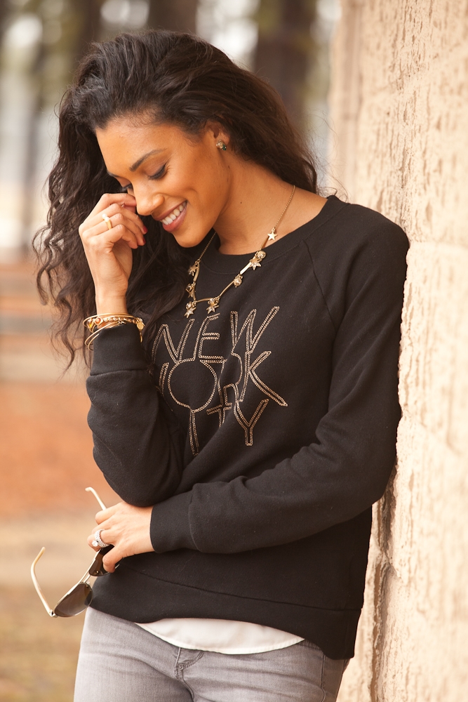 This brings me to todays post, and one of my favorite fitness trends I like to incorporate into my everyday style is the SWEATSHIRT. I am not talking about the five dollar Wal-Mart oversize grey sweatshirt, but the cute, fitted, and easily accessorized ones of today. My favorite sweatshirts tend to be ones Wildfox Coutour or J Crew and even the J Crew Outlet. They are usually lightweight cotton which is breathable all year round, and they can be dressed up or down. I have some short sleeve and some long, but for this time of year when we all have put our winter coats away, but still need a sleeve to be comfortable, here is a great way to dress up a sporty basic, and of course…rep my favorite city in the world.