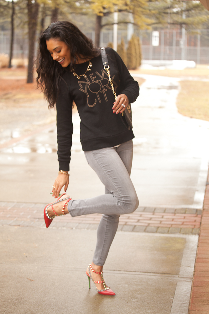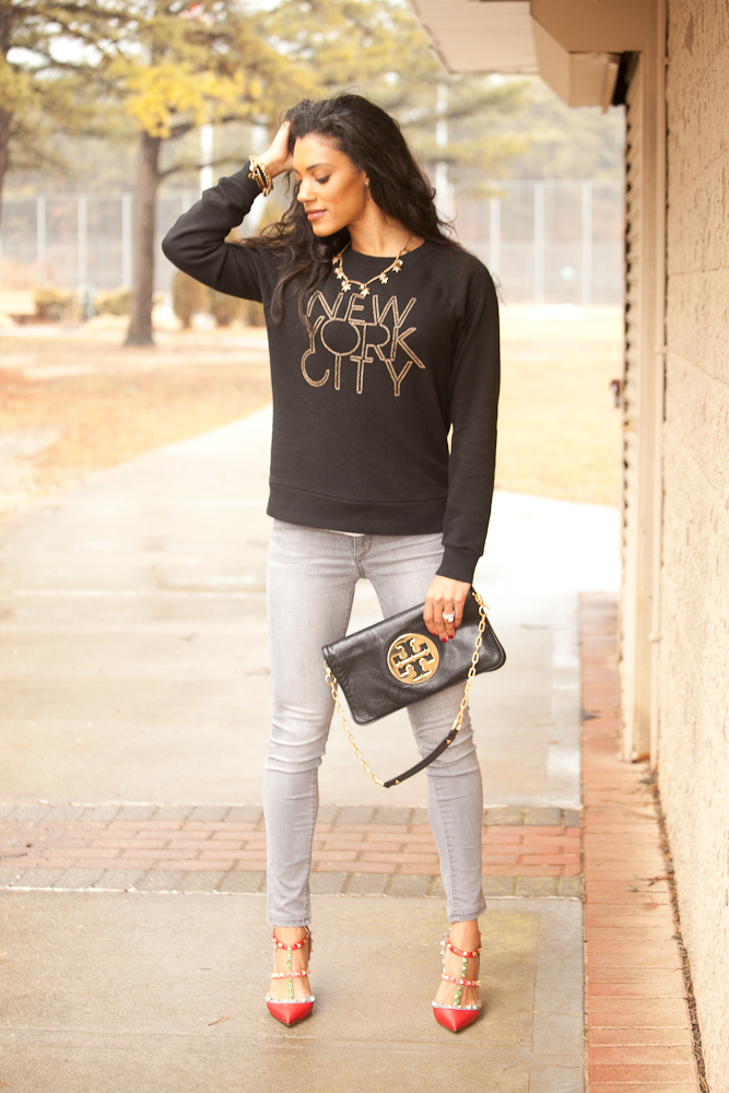 JCrew Sweatshirt <<>> Joes Jeans <<>> Valentino Rockstuds (Spring Version) <<>> Tory Burch<<>>Alex and Ani<<>> Stella VallePearlRing <<>> Star Necklace<<>> H & M V Neck Blouse